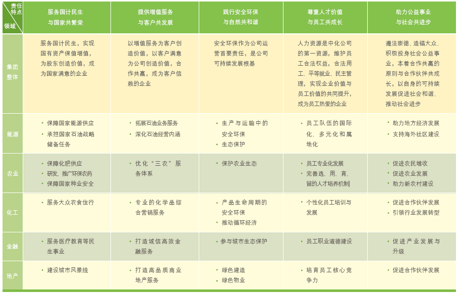 报告针对中化集团多元化业务的特点,构建了社会责任实践矩阵,系统梳理了公司在能源、农业、化工、金融、地产五大业务板块社会责任实践的主要内容,既回应了利益相关方对公司的期望,又便于利益相关方集中了解公司社会责任实践的特点。